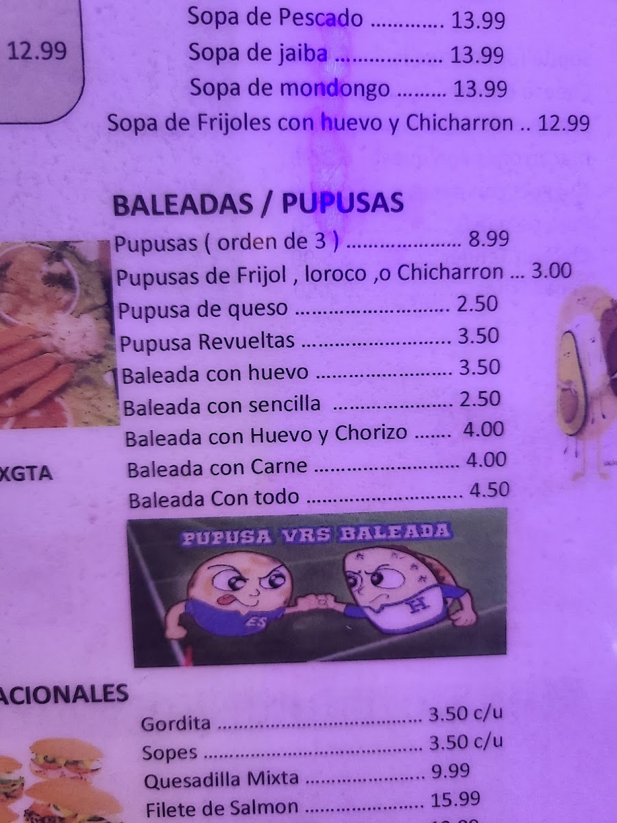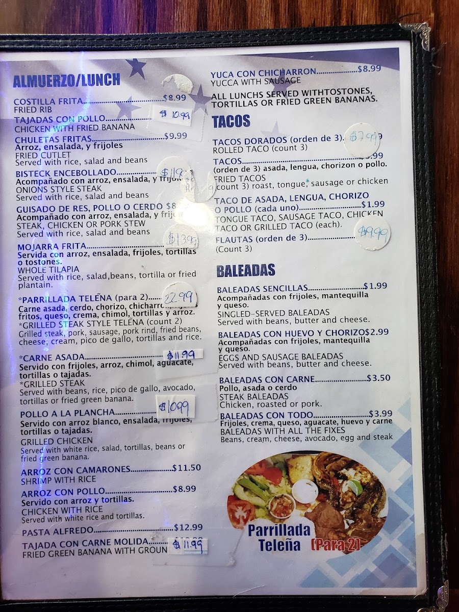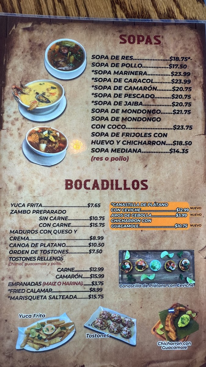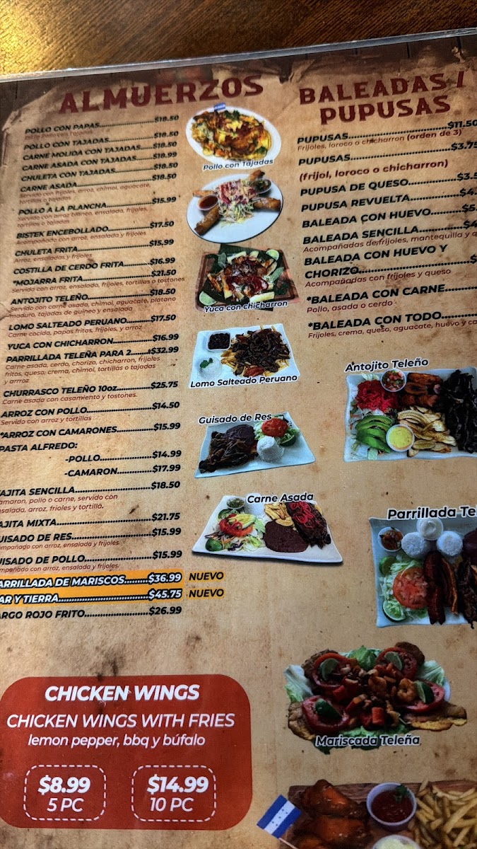 The menu is structured to accommodate different mealtimes and dining preferences, from breakfast items like scrambled eggs and baleadas to heartier lunch and dinner plates featuring grilled meats and seafood. It is suited for casual dining occasions where guests can enjoy a range of Honduran flavors in a single visit.