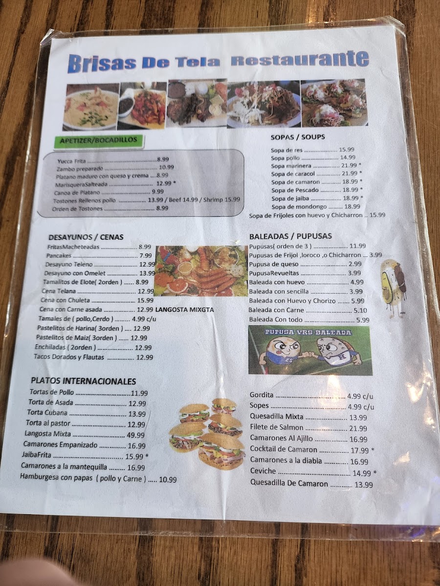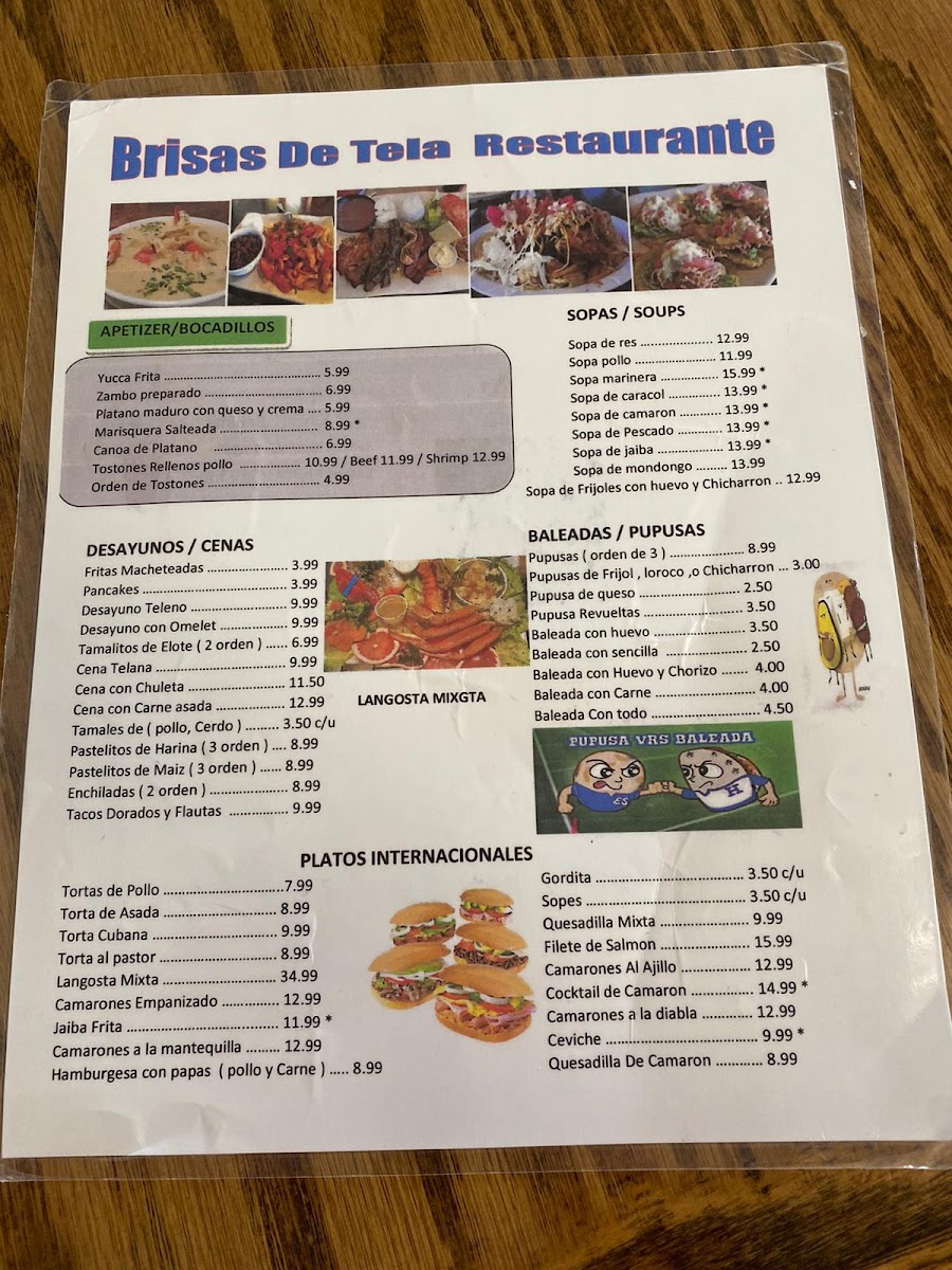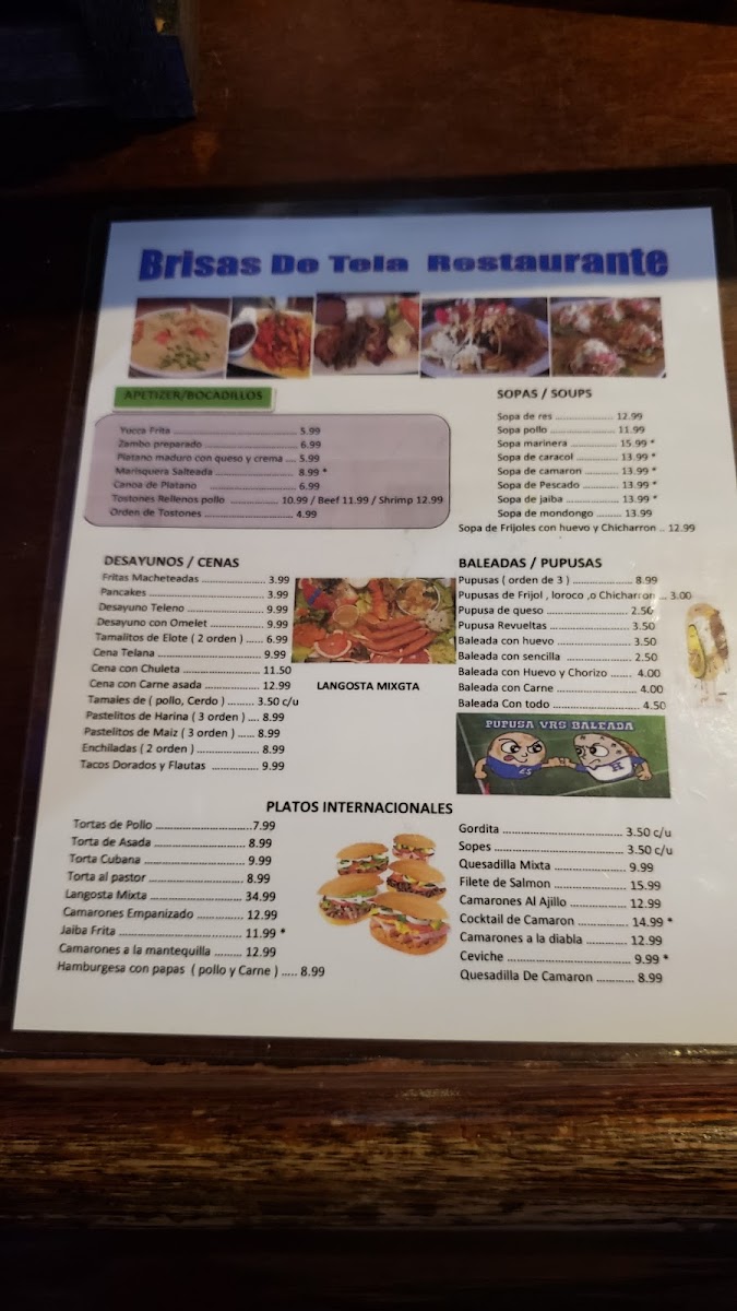 The menu at Brisas De Tela offers a variety of traditional Honduran dishes alongside options suitable for children and sweet desserts. It features a selection of main courses including classic items such as scrambled eggs, tajada con pollo, baleadas, pupusas, mojarra frita, cena con carne asada, bistec y arroz con ensalada, churrasco, and seafood soup. There are also specialty dishes like lomo saltado, guisado de res, ceviche, and langosta mix.